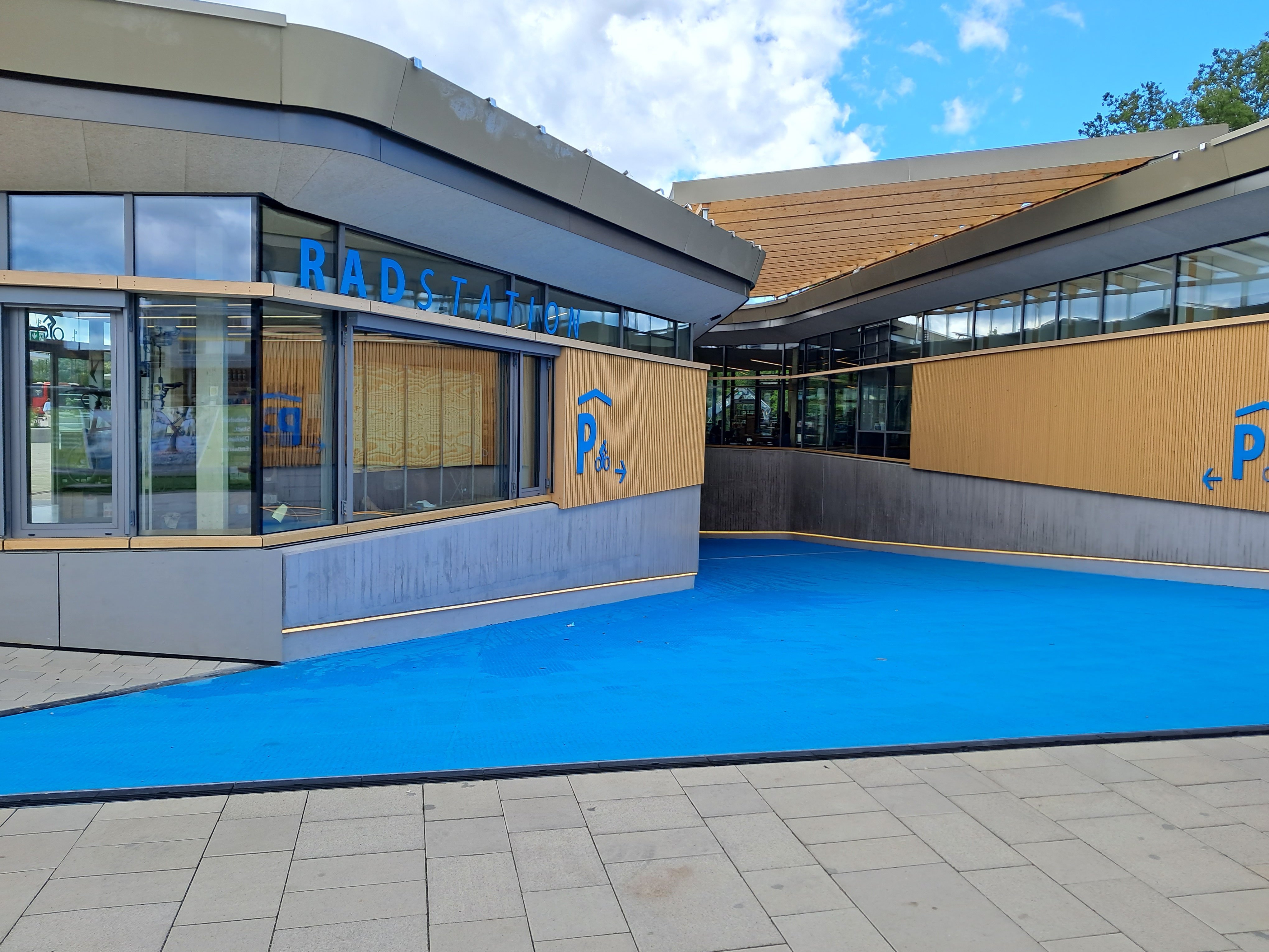 Die Radstation bietet oberirdisch zahlreiche Service-Dienstleistungen an: Kostenfreies Radparken, Schließfächer, Duschen,